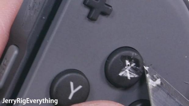 Tiếp đó là phần tay cầm, trước sự 'tàn phá' của chiếc dao rọc giấy, thì có vẻ hầu hết các bộ phận, vỏ bọc của máy Switch đều được làm từ nhựa. Tuy là thế, lớp vỏ bọc của Joy-Con bằng cao su thì tỏ ra khá là dày và bền. Một điểm đáng chú ý ở đây chính là phần thiết kế của những phím bấm phía trên. Thoạt nhìn thì mọi người có thể sẽ lầm tưởng là các kí tự được in lên bề mặt của phím, thế nhưng khi cạy ra thì có thể dễ dàng nhận thấy các kí tự được thiết kế liền khối cùng với phím bấm. Chính nhờ ưu điểm này, người chơi có thể thoải mái 'tryhard' mà không phải lo nghĩ đến tình trạng phím bấm bị bong tróc hay mờ kí tự.