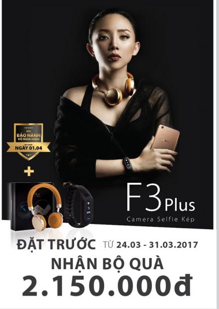 OPPO cũng đã chính thức xác nhận về thời gian đặt trước sản phẩm OPPO F3 Plus sẽ bắt đầu từ ngày 24/3 đến ngày 31/3/2017. Đặc biệt hơn, khách hàng đặt mua trước sản phẩm mới này sẽ nhận được bộ quà tặng trị giá 2.15 triệu đồng bao gồm tai nghe Bluetooth và vòng đeo tay H-band sành điệu của chính nhà sản xuất Trung Quốc.