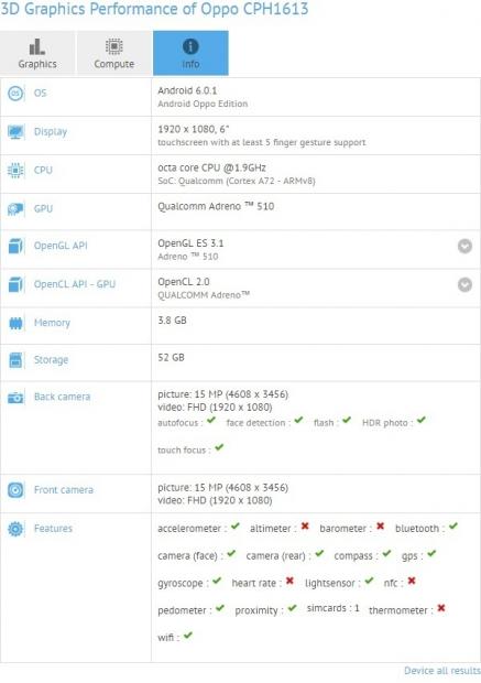 Ngoài ra, danh sách thông số trên GFXBench còn tiết lộ cả hai camera trước và sau của OPPO F3 Plus đều có độ phân giải lên tới 16 MP, có thể thiết bị sẽ có thêm một camera phụ ở mặt trước. Nhà sản xuất Trung Quốc đã tích hợp cho sản phẩm mới của mình viên pin dung lượng lớn tới 4000 mAh.