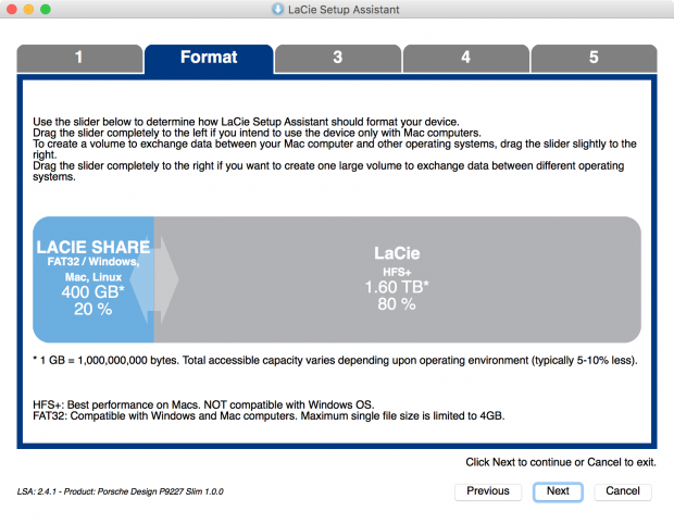 Tương tự như một số ổ khác của LaCie, LaCie Porsche Design USB-C mặc định sử dụng định dạng trên Mac, tuy nhiên chúng ta có sẵn phần mềm để cài đặt và định dạng ổ cứng. Trong đó cho phép chúng ta tùy chọn chia 2 phân vùng, 1 bên HFS+ cho Mac và 1 bên là FAT32 dành cho các máy chạy Windows cũng đọc được. Tất nhiên là định dạng Fat32 thì sẽ hơi bất tiện xíu nếu chép file lớn hơn 4GB nhưng tất nhiên vẫn là một tính năng khá hay, dành cho những ai vừa có nhu cầu xài đa hệ điều hành.