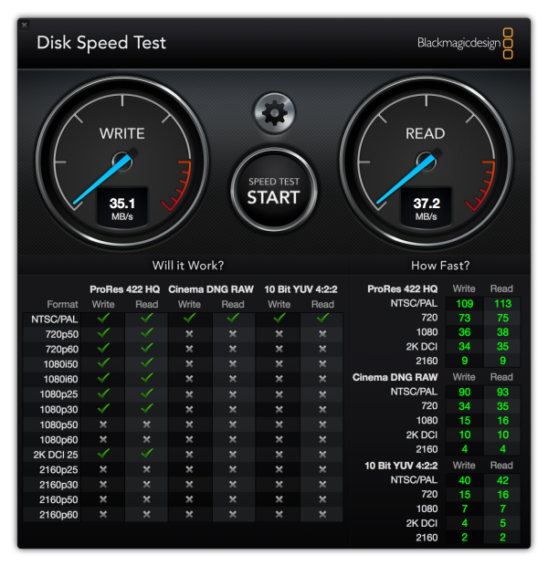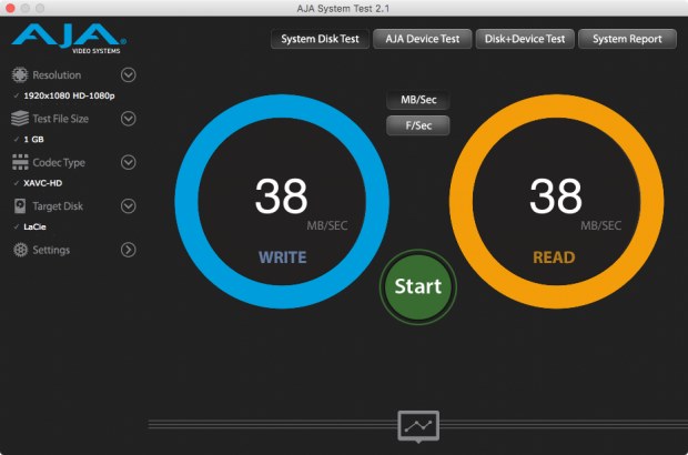 Mình tiến hành thử nghiệm với 2 ứng dụng là Blackmagic Speed Test, AJA System Test trên Mac Siera và CrystalDiskMark 5.2.0 trên Windows 10 64bit với cùng một máy tính là MacBook Pro 15 Retina 2015. Kết quả tốc độ được thể hiện như bên dưới.