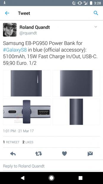 Ngoài hình ảnh thì Roland còn tiết lộ tên mã của sản phẩm là EB-PG950 (tên mã của Galaxy S8 là SM-G950), dung lượng 5.100 mAh, hỗ trợ sạc nhanh công suất 15W, cổng kết nối USB truyền thống và USB Type - C, giá bán dự kiến là 59.9 EUR (khoảng 1.5 triệu).