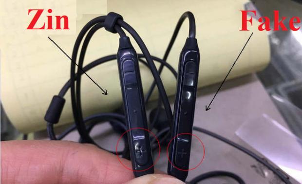 6. Nút bấm của tai nghe AKG chính hãng được gia công tốt, không sắc cạnh, các chi tiết lổi, lõm được hoàn thiện tốt hơn. Đường rãnh ghép trên thân nút bấm của tai nghe fake rất xấu, có thể dùng móng tay để nạy ra. Ngoài ra các nút bấm cho cảm giác êm tay còn tai nghe giả thì cứng.