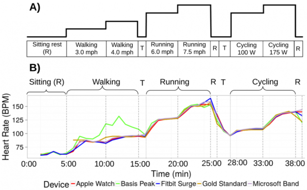 Các nhà nghiên cứu đã đánh giá Apple Watch, Samsung Gear S2 cùng một số thiết bị khác như Basis Peak, Fitbit Surge, Microsoft Band, Mio Alpha 2, PulseOn. Kết quả của những bài kiểm tra này được liệt kê như bên dưới. Apple Watch là thiết bị có kết quả đo đạc ít sai sót nhất so với những ứng cử viên khác trong danh sách. Trong khi đó Samsung Gear S2 lại chót bảng với số lượng sai sót nhiều nhất trên cả 2 tiêu chí là đo nhịp tim và lượng calo tiêu thụ của người dùng.