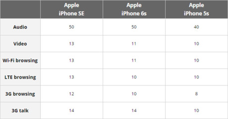 Thông số thời lượng pin sử dụng tương ứng với các chức năng cho thấy iPhone SE nổi trội hơn - Ảnh chụp màn hình