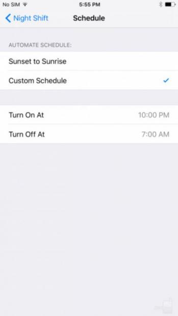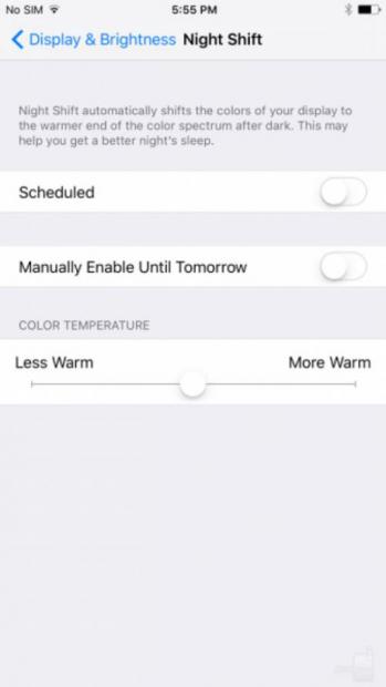 Mặc dù, tính năng Night Shift có thể được thao tác thủ công theo ý muốn của bạn, nhưng người sử dụng được phép rời iOS để thực hiện chức năng này; Theo đó vị trí và thời gian hiện tại trong ngày cần phải được quan tâm xem có bật lên hay chưa. Tính năng này tương tự với thanh trượt điều chỉnh độ sáng của thiết bị, cho phép bạn tự do thiết lập một lượng ánh sáng xanh thích hợp. Sau khi cài cập nhật iOS 9.3 trên các thiết bị iOS, một điều đầu tiên trước hết, và chắc chắn trong tay thước điều chỉnh màu sắc, đo phạm vi Night Shift điều chỉnh nhiệt độ màu sắc.