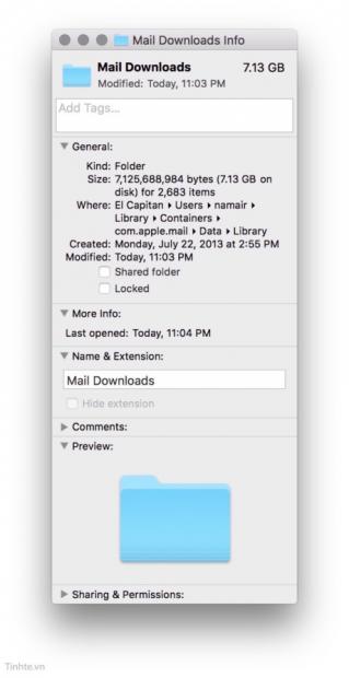 Theo hình đính kèm ngay dưới đây, các bạn có thể thấy là dung lượng thư mục Mail Downloads của mình đã phình to lên đến 7.13GB, được tạo từ hồi 2013 (và giữ qua các lần backup) đến nay. Các file này toàn là file đính kèm qua mail và được lưu lại mỗi khi mình nhấn double click để mở ra.