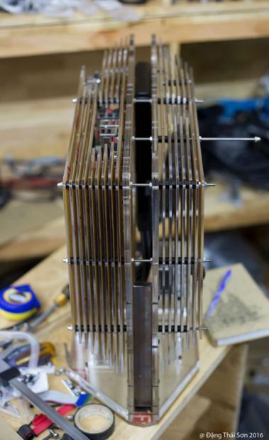 Theo chia sẻ của anh thì ban ngày phải đi làm nên đến tối về mới có thời gian mày mò vẽ, đo, cắt, tính toán các chi tiết... ý tưởng đã có từ lâu mà gần đây anh mới có thời gian thực hiện. Mọi việc chính thức bắt đầu từ khoảng sau Tết, mất 1 tuần đầu lên ý tưởng, tiếp theo là lựa chọn linh kiện, đặp ship đồ watercool về Việt Nam, chờ khoảng 1 - 2 tuần mới đủ hết đồ. Lâu nhất là block VGA, riser nối VGA và main...