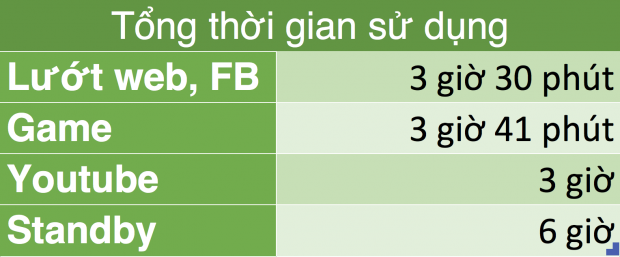 - Thử mỗi tác vụ trong 30 phút đến khi hết pin bao gồm: lướt web + FB (chrome + Chat + FB), xem Youtube, chơi game (Asphalt 8 + Liên Quân Mobile online, xen kẽ), sử dụng tất cả bằng Wifi.
