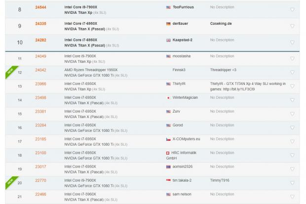 Xếp trên một bậc là Intel Core i7-7900X với điểm số chênh lệch không đáng kể. Tuy nhiên nếu đi vào chi tiết kỹ thuật thì mẫu chip của Intel được ép xung lên mức 4,7GHz và sử dụng 4 card Nvidia Titan X (kiến trúc Pascal). Cũng chip 7900X chạy ở 4,6GHz, ghép nối với 4 card GTX 1080 Ti chỉ đạt 22.770 điểm và đứng vị trí 20 trong bảng xếp hạng. Bạn có thể tham khảo bảng Hall Of Fame của 3Dmark tại đây.