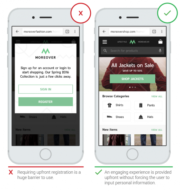 Yêu cầu điền thông tin khách hàng quá sớm sẽ khiến khách hàng e ngạiNhiều người dùng nhanh chóng thoát khỏi ứng dụng hoặc bản di động của website bán hàng ngay khi thấy yêu cầu điền thông tin cá nhân trừ khi đó là những thông tin cần thiết khi thanh toán. Trên thực tế, các ứng dụng có khả năng nhận diện thương hiệu thấp hoặc định vị thương hiệu chưa rõ ràng – rất cần làm rõ thông tin khi yêu cầu khách hàng đăng nhập. Điều này sẽ giúp khách hàng thêm an tâm đối với thương hiệu ít tên tuổi và từ đó mới có thể đem đến cho người dùng những trải nghiệm đầu tiên thật ấn tượng. Vì vậy, bạn chỉ nên yêu cầu khách hàng đăng nhập khi thật cần thiết thôi nhé và một cách đơn giản nhất chính là yêu cầu đăng nhập khi khách hàng muốn bắt đầu thanh toán.