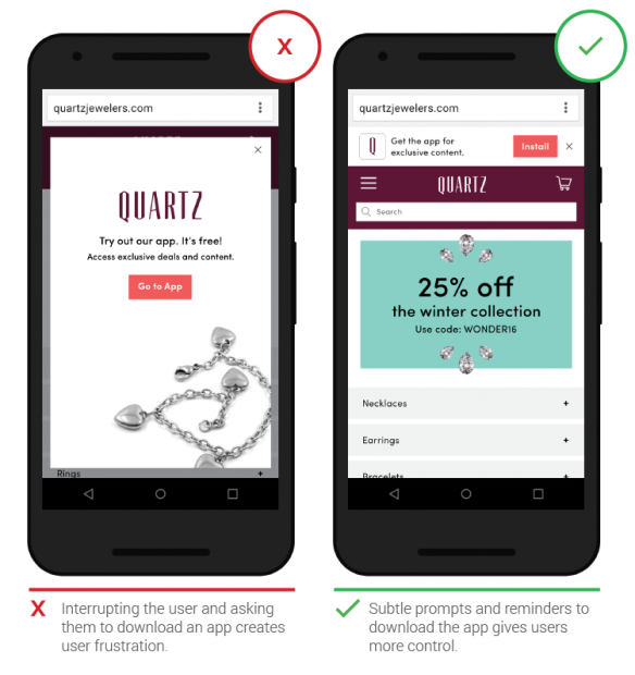 Đề nghị khách hàng tải app sẽ khiến người dùng khó chịuNgười dùng thường e ngại khi phải tải xuống ứng dụng từ các nhà bán lẻ mà họ không quen thuộc. Các chiến dịch quảng cáo hiển thị trên phiên bản di động của website, app bán hàng được tung ra nhằm khuyến khích người dùng tải ứng dụng xuống lại gây nên tác dụng phụ rất nguy hiểm. Ngay khi thấy một quảng cáo hiện ra, người dùng sẽ bị xao lãng và đôi khi là ngưng việc mua hàng, thanh toán để tải app và rất nhanh thôi họ sẽ quên mất là mình vừa định thanh toán cho sản phẩm nào đó. Tăng tính kết nối thông quan trải nghiệm trên phiên bản di động của website là cách tốt nhất để khuyến khích người dùng xem và tải ứng dụng của cửa hàng qua đó đem lại trải nghiệm mua sắm trên di động chuyên nghiệp. Vì vậy, khi bạn hiển thị các chương trình quảng cáo hay tải ứng dụng, hãy sử dụng banner với kích thước và vị trí phù hợp.