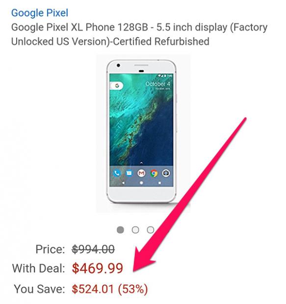 Từ smartphone, tablet, đặc biệt là những món phụ kiện như sạc cáp, miếng dán màn hình,... được giảm giá hơn 50% là chuyện bình thường. Chẳng hạn như mẫu Google Pixel XL bản 128 GB được giảm giá đến 53% hay pin sạc dự phòng cho smartphone được giảm tới 72% trên website Amazon tại Mỹ.
