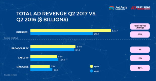 Theo nguồn từ Nielsen, chỉ duy nhất truyền hình kỹ thuật số và truyền hình cáp giữ được mức doanh thu không biến động quá nhiều, những kênh khác, thậm chí cả các tờ tạp chí, cũng ghi nhận mức sụt giảm doanh thu đến 10%. Ở chiều ngược lại, doanh thu quảng cáo trên internet đạt 20.7 tỉ đô la Mỹ, gần gấp đôi kênh truyền hình kỹ thuật số (11.6 tỉ), gấp ba lần truyền hình cáp (6.4 tỉ).