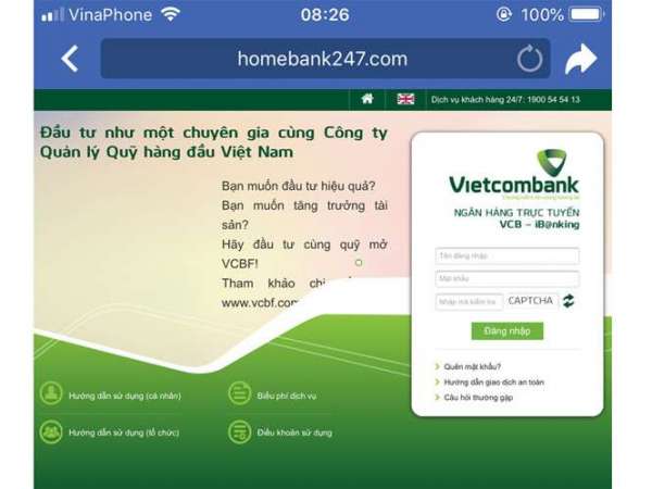 Khi chúng tôi đăng nhập địa chỉ này, bên tay phải màn hình là giao diện y như Ngân hàng trực tuyến VCB-iB@nking với các mục như tên đăng nhập, mật khẩu, nhập mã kiểm tra…Trang web cũng hiện ra một dòng “Trang web không bảo mật” khi đăng nhập bằng điện thoại di động...