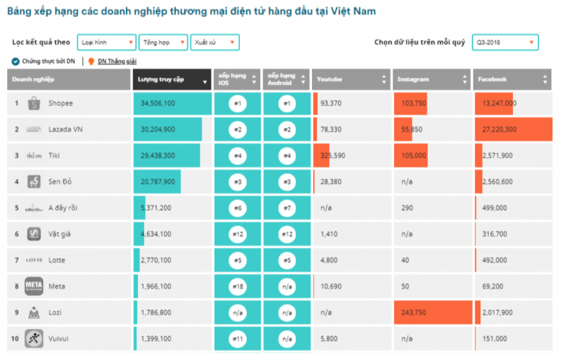 Sự tăng trưởng này, cộng với việc Lazada Vietnam có sụt giảm nhẹ 7.6% so với quý trước đã giúp Shopee lần đầu tiên soán ngôi Lazada Vietnam trên bảng xếp hạng (bắt đầu tính từ Q2/2017).