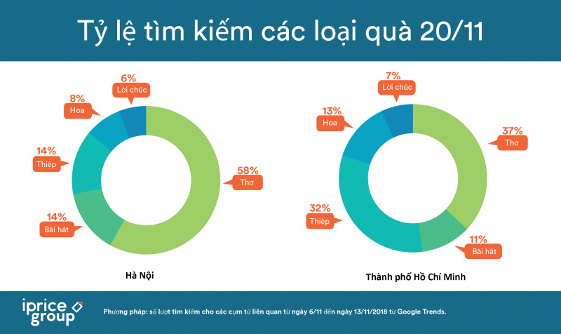 Còn ở chiều ngược lại, người dân Thành phố Hồ Chí Minh lại rất quan tâm đến các mẫu thiệp đẹp cho 20/11. Có đến 32% số lượt tìm kiếm về 20/11 ở thành phố này là cho cụm từ “thiệp 20/11”, khá cao so với trung bình cả nước chỉ 17%.