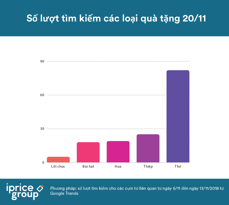 Công ty thương mại điện tử iPrice Group mới đây đã dựa vào số lượt tìm kiếm trên Google để tổng kết các hình thức tri ân 20/11 được cư dân mạng ưa chuộng nhất năm nay.