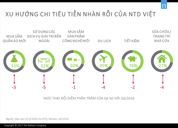 Cùng với xu hướng tiết kiệm, người tiêu dùng tại Việt Nam tiếp tục sẵn lòng chi tiêu vào các khoản mục lớn. Khảo sát của Nielsen cũng cho thấy rằng, sau khi chi trả cho các phí sinh hoạt thiết yếu, khoảng hai trong năm NTD Việt sẵn sàng để chi cho du lịch (35%), mua sắm quần áo mới (33%), các sản phẩm công nghệ mới (30%) , sửa chữa nhà cửa (27%) và các dịch vụ giải trí bên ngoài (26%).
