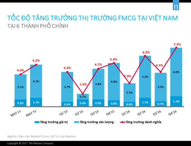 Ngành Hàng Tiêu Dùng Nhanh (FMCG) tại 6 thành phố lớn của Việt Nam (Hà Nội, Tp. HCM, Hải Phòng, Cần Thơ, Nha Trang và Đà Nẵng) cho thấy sự tăng trưởng mạnh trở lại trong quý cuối cùng của năm 2016, với mức tăng trưởng dương 7,3% so với năm trước – tốc độ tăng trưởng cao nhất trong ba năm qua.