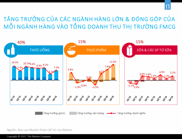 Sự tăng trưởng này chủ yếu là do mức tăng 6,0% từ tăng trưởng sản lượng, theo báo cáo hằng quí - Market Pulse, được phát hành bởi Nielsen Việt Nam - công ty đo lường hiệu suất toàn cầu.