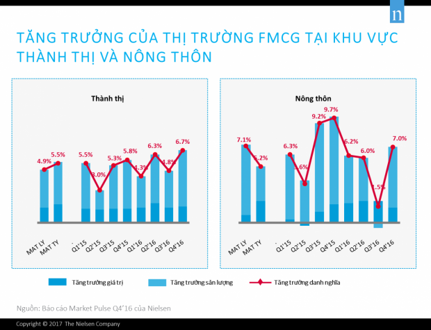 Khu vực nông thôn đã liên tục được nhắc đến như là một nguồn tăng trưởng mới cho nhiều nhà sản xuất. Câu chuyện này một lần nữa được nhìn thấy rõ rệt trong năm 2016. Báo cáo cũng cho thấy rằng vùng nông thôn tăng mạnh trở lại trong quý cuối cùng của năm 2016 ở mức 7%, đóng góp 51% vào tổng doanh thu ngành hàng tiêu dùng trên toàn quốc. Hơn nữa, sự tăng trưởng FMCG ở khu vực thành thị là 6,7% trong Q4'2016. Điểm sáng trong báo cáo lần này là sự tăng trưởng của cả khu vực thành thị và vùng nông thôn chủ yếu đến từ tăng trưởng sản lượng.