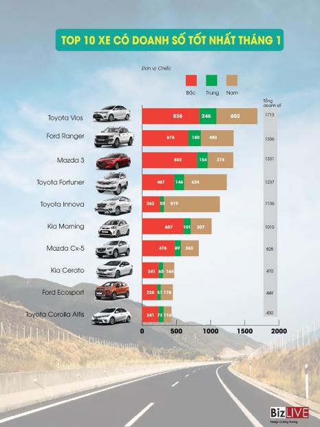 'Tại miền Bắc, top 5 mẫu ô tô bán chạy nhất khá giống với bảng xếp hạng 10 mẫu xe ăn khách của cả nước năm 2016 khi đứng đầu là Toyota Vios, Kia Morning và Mazda 3. Còn tại miền Nam, dòng xe 7 chỗ lại là những mẫu ô tô được ưa chuộng nhất với hai
