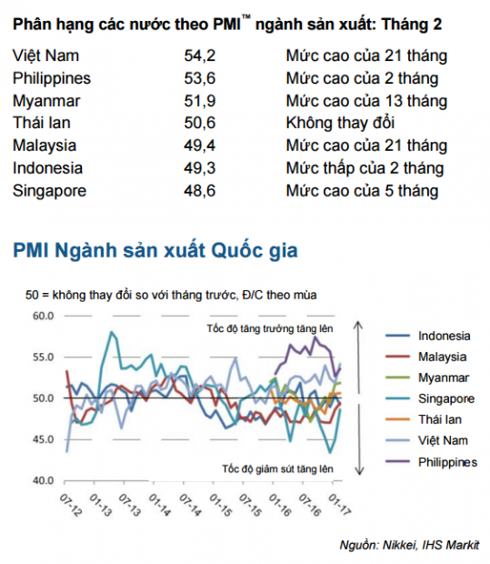 Đặc biệt, Việt Nam đã vượt Philippines khi có tăng trưởng mạnh nhất trong tháng 2, và có các điều kiện hoạt động được cải thiện tốt nhất trong 21 tháng. Các nhà sản xuất ở Philippines đã có tăng trưởng nhanh, mặc dù là yếu hơn so với mức trung bình của cả năm 2016. Myanmar có tăng trưởng mạnh hơn một chút trong khi lĩnh vực sản xuất của Thái Lan tiếp tục tăng trưởng với một tốc độ vừa phải. Đồng thời, Malaysia và Singapore có sự giảm sút chậm hơn, trong khi PMI của Indonesia đã quay đầu giảm trở lại.