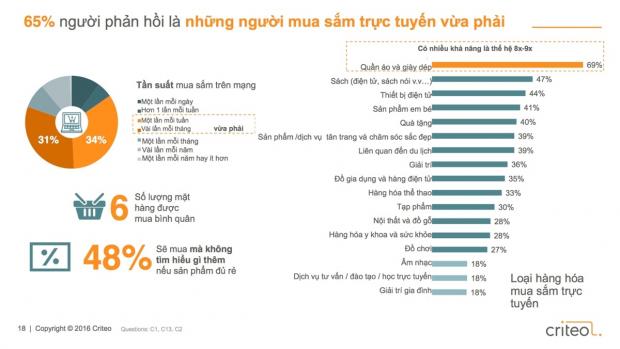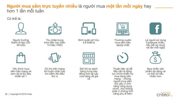 Người mua sắm online mỗi ngày một lần hoặc hơn một lần mỗi tuần như nói trên được xem là người mua sắm trực tuyến nhiều. Đánh giá của Criteo cho thấy người này cũng là người dùng Facebook nhiều, hầu hết sử dụng vài lần mỗi ngày. Đây là người trưởng thành đã đi làm (30-49 tuổi), có thu nhập từ trung bình đến cao, tức trên 10 triệu đồng/tháng. Người này có thể sở hữu trung bình 5 thiết bị (chính xác là 4,8).