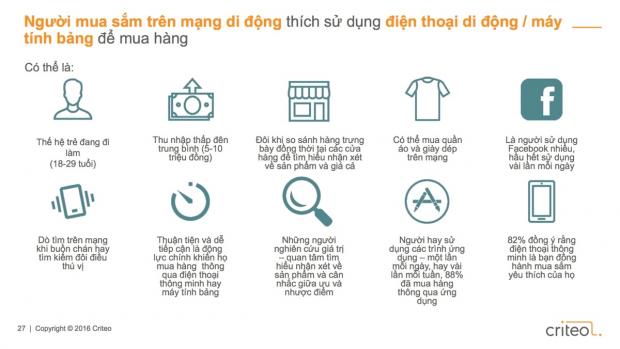 Công ty công nghệ tiếp thị Criteo (Pháp) gần đây tung ra khảo sát về người tiêu dùng trên các thiết bị kỹ thuật số tại Việt Nam. Bảng đánh giá cho thấy thói quen mua sắm qua mạng của người dùng đang tăng cao, trong đó mua sắm qua di động có thể là xu hướng tiếp theo.