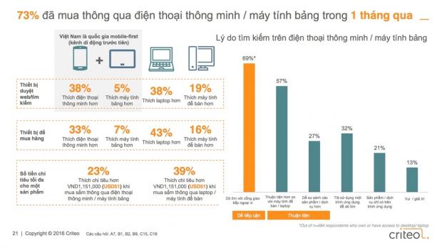 Trong một tháng qua kể từ ngày khảo sát, có đến 73% người được hỏi cho biết có mua sắm qua thiết bị di động như điện thoại thông minh, máy tính bảng. Chính tỷ lệ này khiến công ty tiếp thị Criteo cho rằng Việt Nam là quốc gia mobile-first, tức tiên phong trong việc dùng thiết bị di động, một nền tảng chuẩn bị cho xu hướng m-commerce.