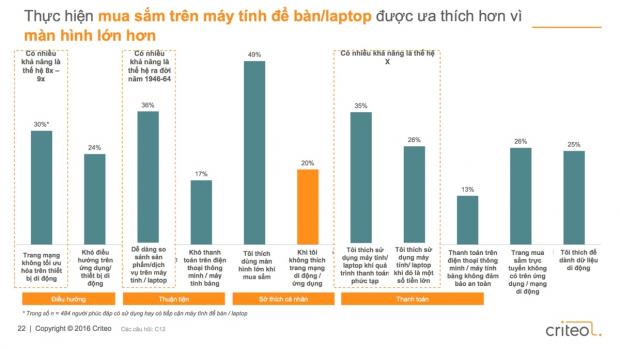 Bên cạnh nhóm hay mua hàng qua di động, có nhóm người thích mua hàng qua laptop hay máy tính để bàn. Lý do của việc này là màn hình các thiết bị này lớn hơn (49%). Ngoài ra, mua trên website máy tính họ có thể so sánh sản phẩm/dịch vụ, hoặc để dễ dàng hơn khi thanh toán online, cũng có thể do trang mua sắm của họ không tối ưu cho thiết bị di động.