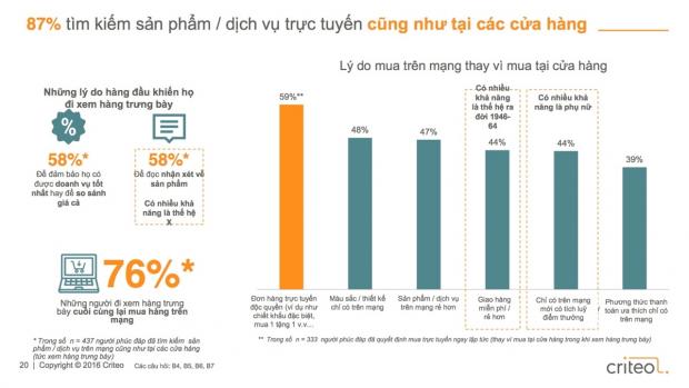 Có 76% người đi xem hàng hóa ở các cửa hàng nhưng lại quyết định mua hàng qua mạng. Lý do việc mua hàng qua mạng là: mua online có chương trình bán hàng độc quyền, màu sắc/thiết kế chỉ có trên mạng, sản phẩm/dịch vụ trên mạng rẻ hơn.