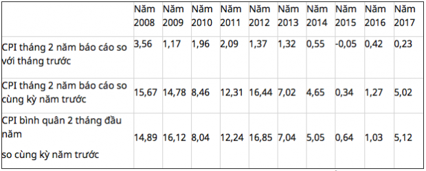 Trong công bố mới nhất về chỉ số giá tiêu dùng (CPI) tháng 2 năm 2017 vừa được Tổng cục Thống kê đưa ra cho thấy, CPI tháng này đã tăng 0,23% so với tháng trước, tăng 5,02% so với cùng kỳ năm trước, tăng 0,69% so với tháng 12 năm trước; CPI bình quân hai tháng đầu năm 2017 so với cùng kỳ năm trước tăng 5,12%.