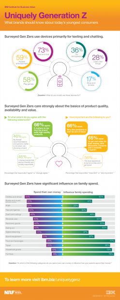 Theo nghiên cứu vừa được IBM và Liên đoàn Bán lẻ Quốc gia Hoa Kỳ (NRF) công bố, được sinh ra từ giữa thập niên 1990 cho đến đầu những năm 2000, thế hệ Z là nhóm rành công nghệ, làm quen với điện thoại di động, thiết bị thông minh và các thiết bị kỹ thuật số trước khi hiểu biết về thế giới bên ngoài. Nhưng nghiên cứu này phát hiện ra 67% thế hệ Z luôn mua sắm tại các cửa hàng thực sự, 31% tiếp theo thi thoảng mua sắm tại đây, đồng nghĩa với việc 98% thế hệ Z có mua sắm trực tiếp tại các cửa hàng.