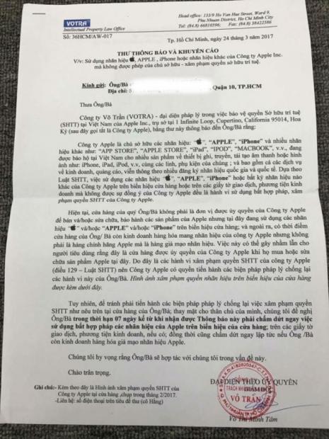 Đáng chú ý, công văn của Công ty Võ Trần gửi đến một số cửa hàng có thêm phần “Có thời điểm cửa hàng của Ông/Bà còn kinh doanh hàng hóa mang nhãn hiệu của công ty Apple nhưng không phải là hàng chính hãng Apple mà là hàng giả mạo nhãn hiệu”.