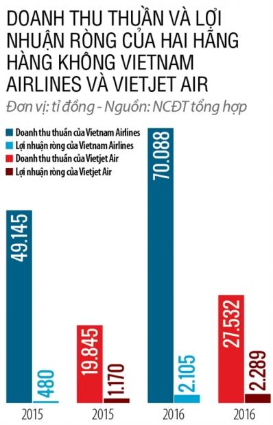 Trong khi đó, với Vietnam Airlines, việc tập trung vào hình ảnh “chiến lược hàng không 4 sao” tiếp tục giữ chân Hãng trong cuộc đua về chi phí, mà nếu không cắt giảm được phần nào, Hãng sẽ tiếp tục thua thiệt trên thị trường về mặt hiệu quả tài chính. Tình hình kinh doanh của Vietnam Airlines trong năm qua vẫn khả quan, với hệ số sử dụng ghế bình quân của mạng bay nội địa (tính đến ngày 15.12.2016) trung bình hơn 80% nhưng hãng này vẫn chịu áp lực về chi phí. Trong văn bản gửi Bộ Giao thông Vận tải gần đây, Hãng cũng thừa nhận doanh thu bình quân hiện nay vẫn cao hơn chi phí, nhưng con số này đang có xu hướng giảm dần qua các năm.