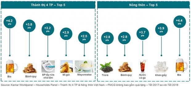 Theo báo cáo mới đây của Kantar Worldpanel, mua sắm cho tiêu dùng tại nhà mùa Tết 2017 ước tính đạt 1.76 tỷ đô, gần gấp đôi so với ngày thường. Chi tiêu cho ngành hàng tiêu dùng nhanh vào dịp Tết năm nay cũng đạt tốc độ tăng trưởng 2 chữ số, cao hơn so với Tết năm ngoái cả ở khu vực Thành thị và Nông thôn.