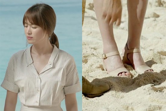 Dù chưa tạo được làn sóng mạnh mẽ như son, BB Cushion hay quần áo, các mẫu giày dép trong Hậu duệ Mặt trời cũng được khán giá chú ý. Những ngày hè sắp tới, các chị em sẽ muốn tìm mua những mẫu giày dép phù hợp và không thể không kể đến mẫu xăng đan màu nuy hay Đôi giày trắng của Comme Des Garcons được Song Hye Kyo diện trong các tập phim. Được đánh giá cao về tính tiện dụng cùng phong cách trang nhã nữ tính, những mẫu xăng đan và giày này phù hợp với nhiều loại trang phục khác nhau và đem lại vẻ đẹp năng động cho các chị em.