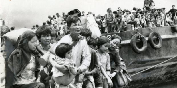 Dòng người tị nạn bu quanh những chiếc tàu hải quân tại Vũng Tàu (Tháng 4/1975).