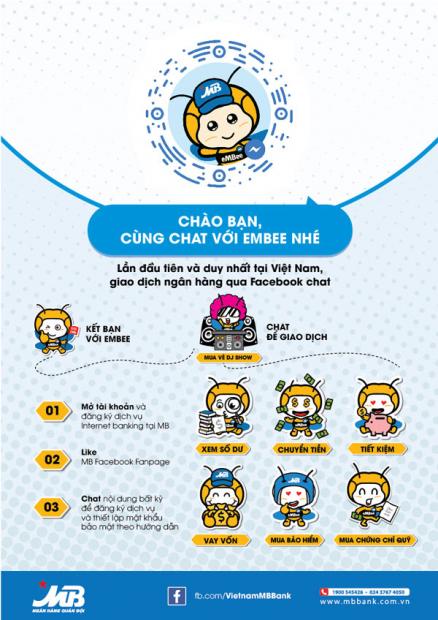Không cần cài đặt ứng dụng, không cần thực hiện nhiều thao tác, cũng không cần ký nhiều giấy tờ, thủ tục…, khách hàng của MB giờ đây chỉ cần thông qua kênh MB Facebook Fanpage, chat với nhân vật đại diện là chú ong eMBee, việc giao dịch ngân hàng sẽ rất dễ dàng và thú vị. Khách hàng có thể thực hiện hàng loạt giao dịch như kiểm tra số dư tài khoản, chuyển khoản trong và ngoài MB, mở tài khoản tiết kiệm, mua bảo hiểm, vay vốn, mua chứng chỉ quỹ…một cách nhanh chóng, tiện lợi và an toàn.