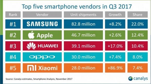 Số liệu từ Canalys, thống kê thị phần và tăng trưởng của top 5 nhà sản xuất thiết bị di động hàng đầu thế giới (Qúy 3 năm 2017 so với Qúy 3 năm 2016)