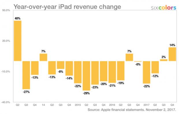 Sang quý IV, doanh số iPad tăng 11 %, trong khi doanh thu tăng 14 %, bước tăng trưởng doanh thu lớn nhất của iPad trong vòng hơn 4 năm trở lại đây. Kết quả này có được nhờ Apple bán ra một số lượng lớn iPad Pro, có thể là model mới giá 649 USD.