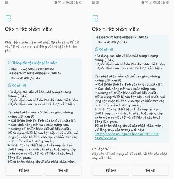 Bản cập nhật mới này có dung lượng gần 500 MB. Bên cạnh bản vá bảo mật Android tháng 10, Galaxy S8 và S8 Plus còn được cải thiện độ ổn định của chế độ DeX, và độ ổn định của launcher (giao diện máy).