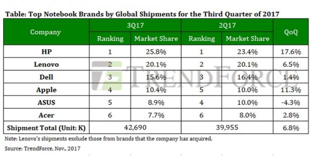 Apple đã đánh bại Asus để trở thành thương hiệu laptop bán chạy thứ 4 thế giới trong quý 3, tổng thể nhà Táo chiếm 10.4% tổng doanh số laptop.