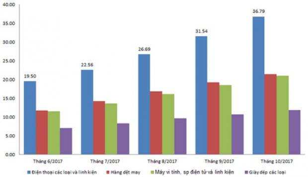 Điện thoại và linh kiện luôn là mặt hàng xuất khẩu hàng đầu (Đơn vị: Tỷ USD)