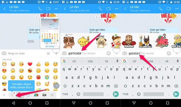 Ngoài ra, trong bản cập nhậ này Zalo còn tích hợp thêm tính năng tìm kiếm sticker trong cửa sổ chat hoặc tìm thủ công bằng cách gõ ký tự @STICKER, @GUGGY.