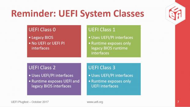 Theo Brian Richardson - một kỹ sư chuyên về firmware đến từ Intel thì cả ngành công nghiệp máy tính đang chuyển sang UEFI Class 3/3+ và phiên bản này có nhiều ưu điểm hơn như kích thước code (ROM và OpROM) nhỏ hơn, tương thích các công nghệ mới tốt hơn và kể từ UEFI Class 3 trở lên, chế độ Legacy BIOS sẽ không còn được hỗ trợ. Tuy nhiên điều này không có nghĩa là tính năng Secure Boot bắt buộc phải bật.