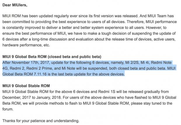 Tuy nhiên theo thông tin mới nhất từ Xiaomi, một số thiết bị có tên trong danh sách dưới đây sẽ kết thức thời gian cập nhật của mình với MIUI9. Nguyên nhân của việc này là vì hãng muốn tập trung và duy trì cập nhật cải thiện hiệu suất cho các thiết bị mới. Danh sách này bao gồm: