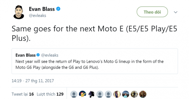 Nói cách khác, bạn có thể mong đợi sự xuất hiện của Moto E5 Play, E5 và E5 Plus, cũng như Moto G6 Play, G6 và G6 Plus vào năm 2018.